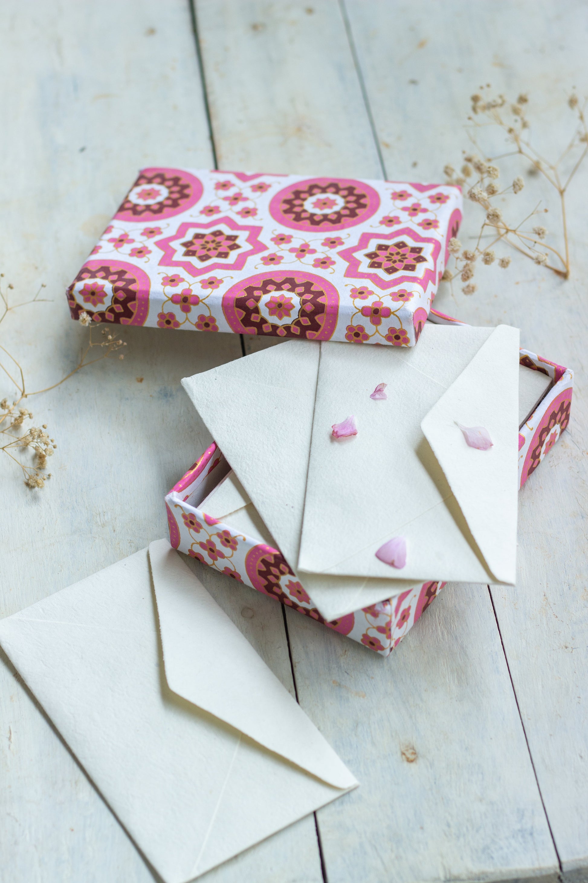 Introducing our beautiful set of 10 notecards and envelopes in a matching box. A great gift for self or for a stationary enthusiast. The paper is made from recycled cotton and paper and is handscreen printed with motifs inspired by the traditional art of hand block print.